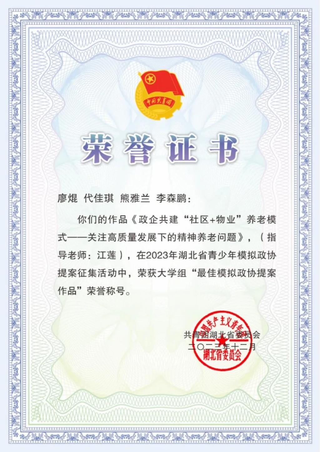 为深入学习宣传贯彻党的二十大精神,引导广大青少年有序参与社会主义民主政治实践,准确理解全过程人民民主内涵实质,领悟新时代伟大变革背后的“制度密码”。yl7703永利集团学子积极参与2023年湖北省青少年模拟政协提案征集活动。其中一组作品荣获大学组“最佳模拟政协提案作品”荣誉称号。让我们一起看看吧!