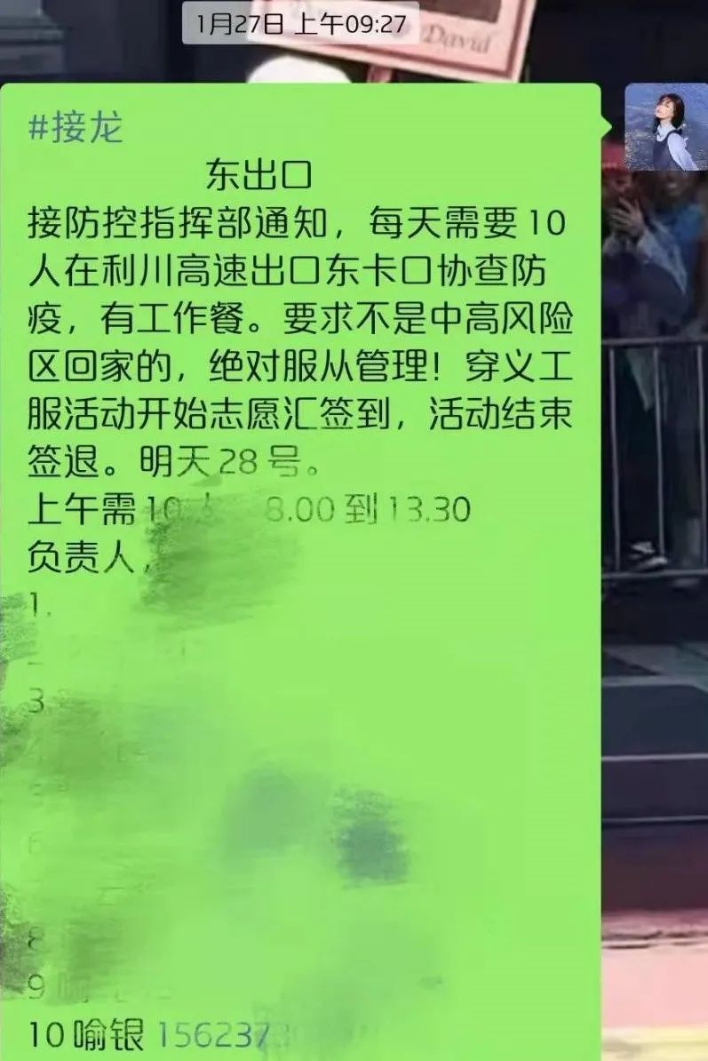 在给车辆填写疫情防控登记表时,有很多驾驶员和随车人员都会问我们“你们冷不冷?”“辛苦了”之类的话。有一次雪天值守的时候,一位驾驶员叔叔边问我“冷不冷?”边从车里拿了两个橘子对我说“你们辛苦了”,还说“过几天我也来(做志愿者)”。驾驶员叔叔和我之间一次简单的寒暄,让我更加感受到了做志愿者的温暖,更加坚定了做志愿工作的信念!
