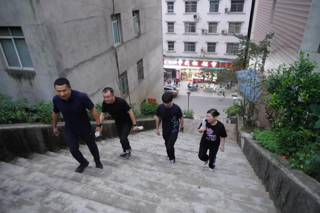 最后,刘超处长带队体验当地特产“百步梯”,从海拔250余米的聚居区,走过370余阶台阶,到达位于山腰的、当地最好的初级中学——沿渡河镇初级中学,这里曾走出过多名985、211、双一流的学生。通过体验他们的求学之路,不仅感受到了当地人民对教育事业的重视,更切身体会到了当地学子求学的不易。“这只是我们的一次体验,但却是当地学子日日夜夜要走的求学之路。我校学子应学习这种坚持不懈的精神,用青春的汗水换美好的未来。”