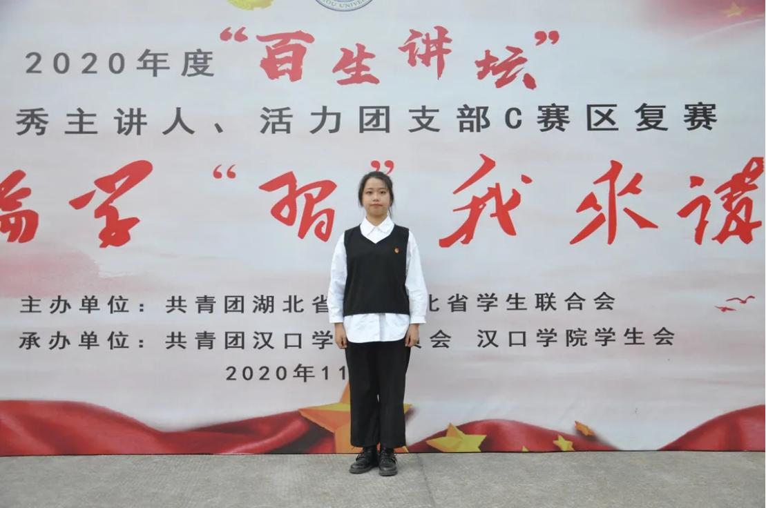 李菲阳同学以“不忘初心,牢记使命”为题,结合自己的故事,表达了自己作为中国新时代青年的责任感,阐述了自己对“初心”的理解。她用激昂的演讲将自己的感情传递给每一位观众,最终获得评委嘉宾们的认可,在湖北省2020年“百生讲坛”100名省级优秀主讲人评选活动中获得了省级优秀铜牌主讲人称号。