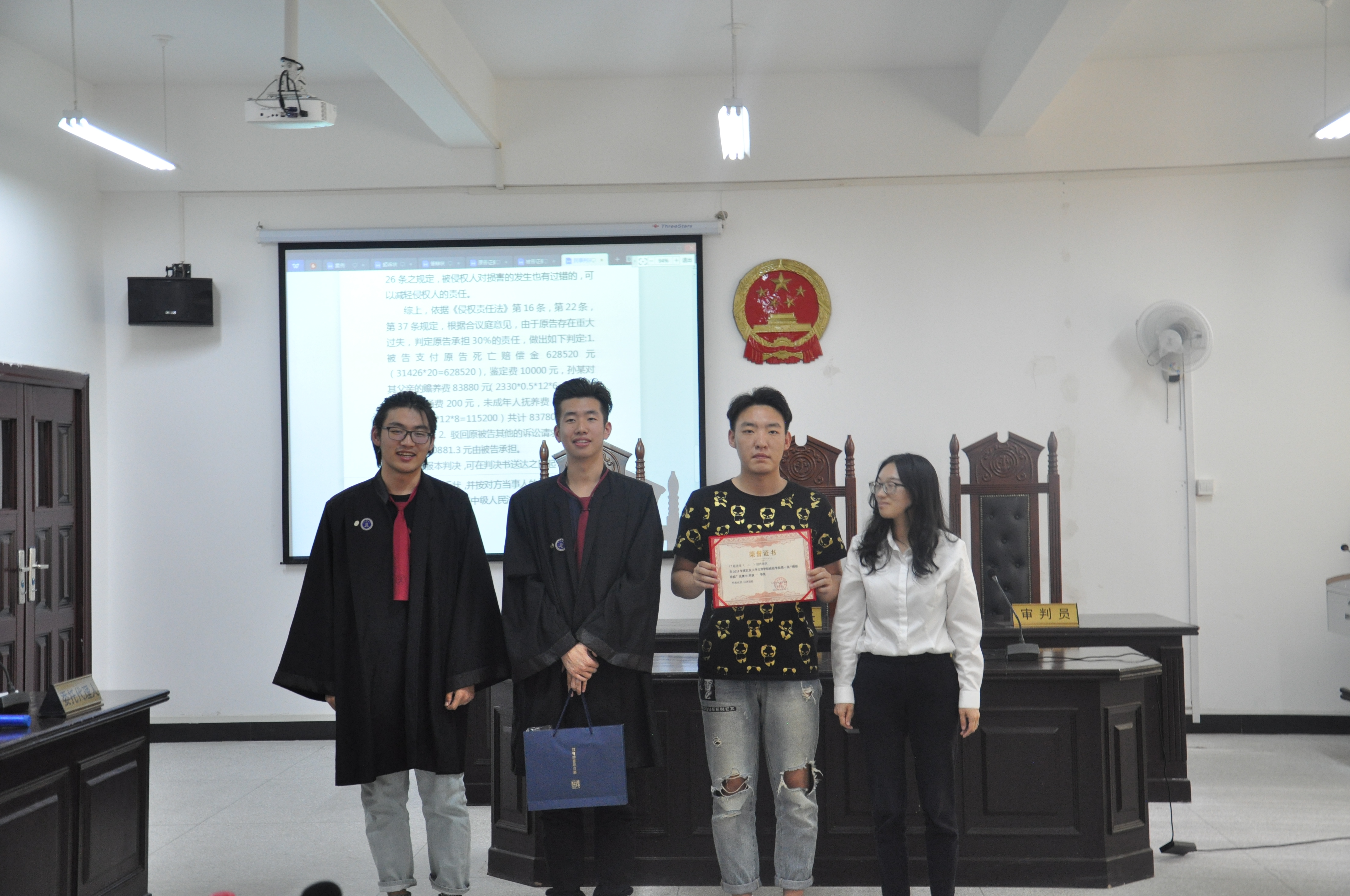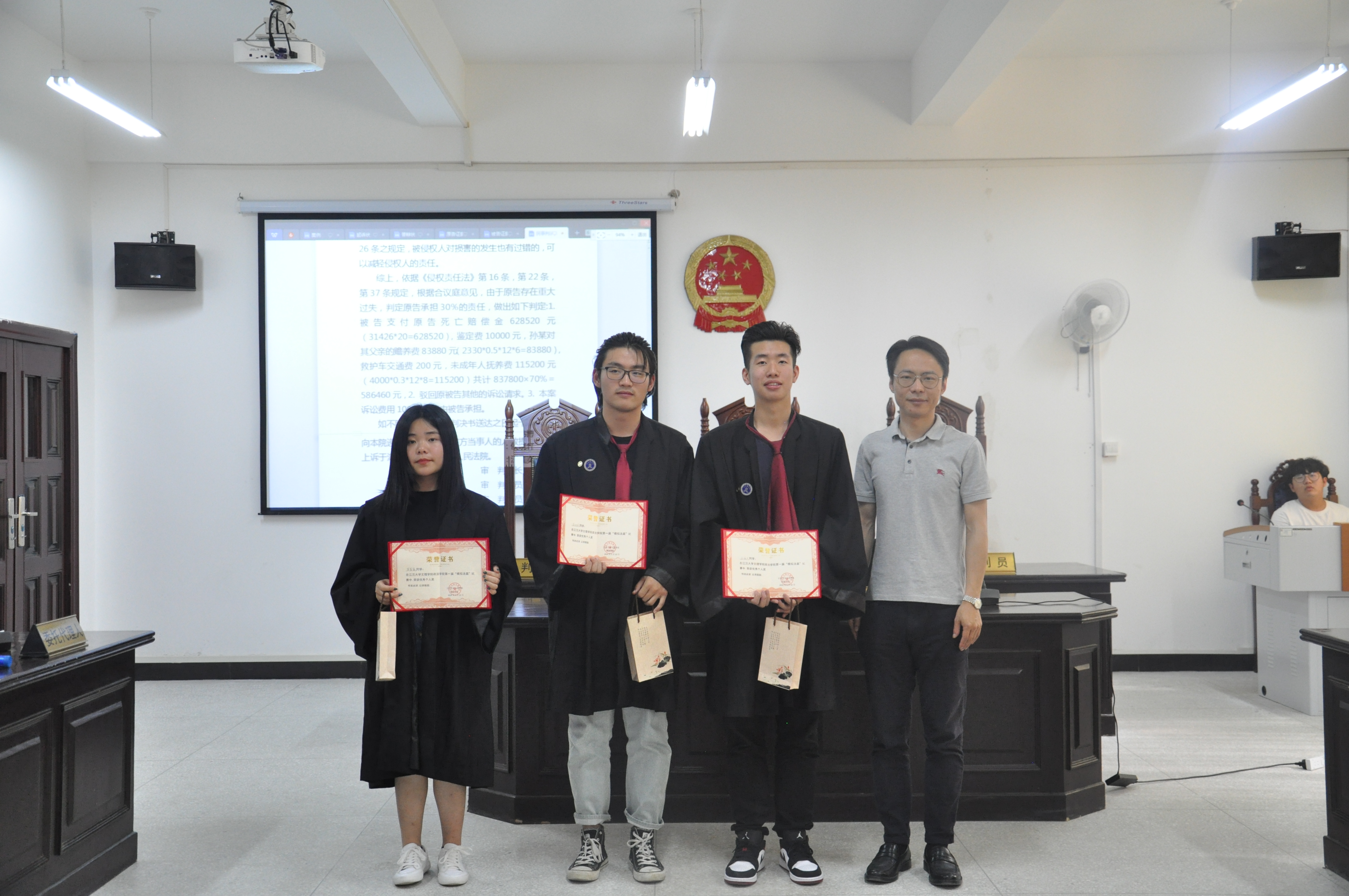 经过评委的评分,由17级法学1班同学担任的法官组在此次模拟法庭大赛中荣获了团体三等奖,由17级法学3班学生担任的原告组在此次模拟法庭大赛中获得了了团体二等奖,一等奖的获得者则是由17级法学二班学生担任的被告组,被告诉讼代理人王冠文、余功成,原告诉讼代理人罗蒙蒙获得个人优秀奖。