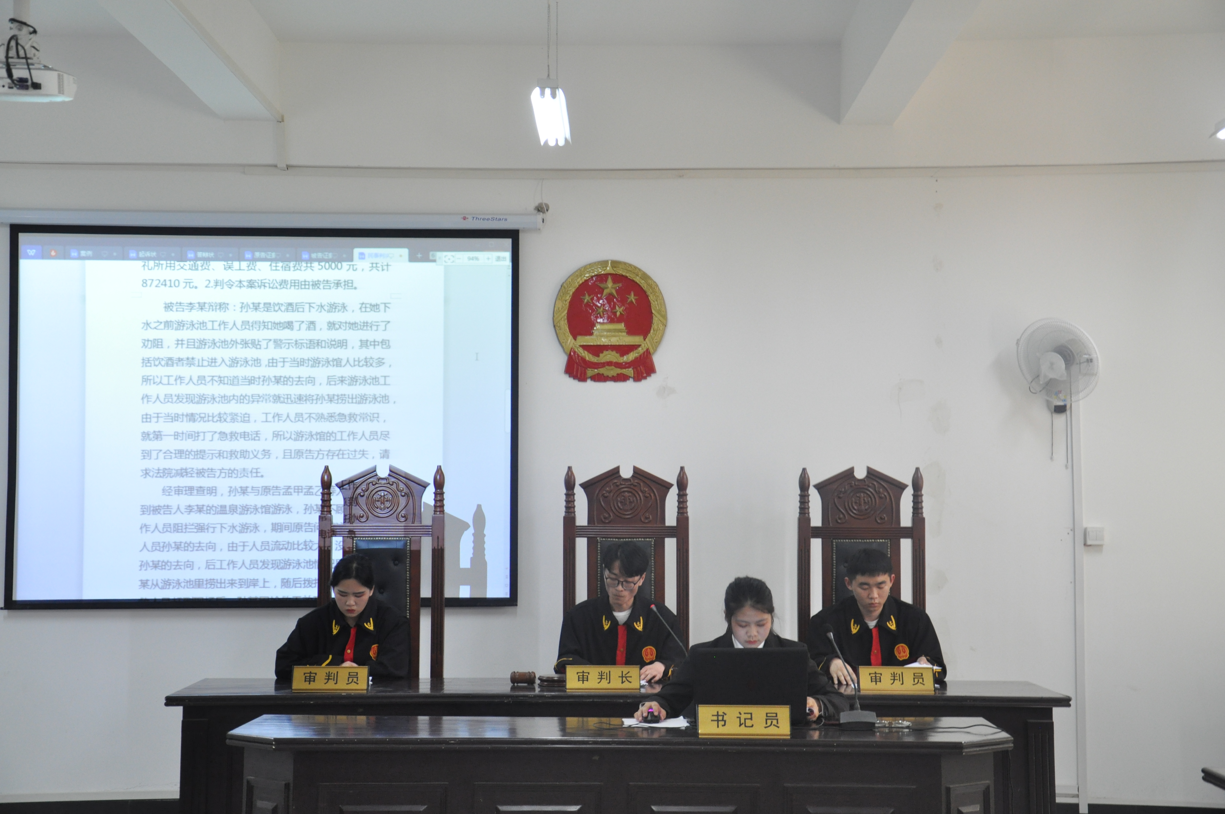 本次模拟法庭的案例为民事侵权纠纷,法官组由17级法学1班的同学担任,原告组由17级法学3班的同学担任,被告组由17级法学2班的同学担任。各班参赛选手准备充分,通过举证、质证、辩论、总结,呈现了一场完整的民事诉讼庭审。