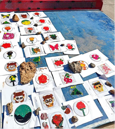 美术课上,陈禹倩老师进行了美术创作课程教学,课程内容既有剔透灵动的玻璃画创作,也有憨趣十足的纸盘画体验。玻璃画创作中,利用亚克力板替代玻璃的巧思,是对童真的细心守护,是对孩童身心的呵护;可水洗丙烯的选择,既保留了色彩的灵动,又给了学生们大胆试错的勇气。在纸盘画创作中,纸盘这一寻常材料也成了独特的画布,让孩童的奇思妙想有了更自由的落脚处。学生们拿起画笔,肆意挥洒创意,有的勾勒出五彩斑斓的花朵,有的描摹着憨态可掬的动漫角色,还有的细细描绘着心中的乡村美景。每一幅作品都跳动着童真的脉搏,盛满了天马行空的想象力。