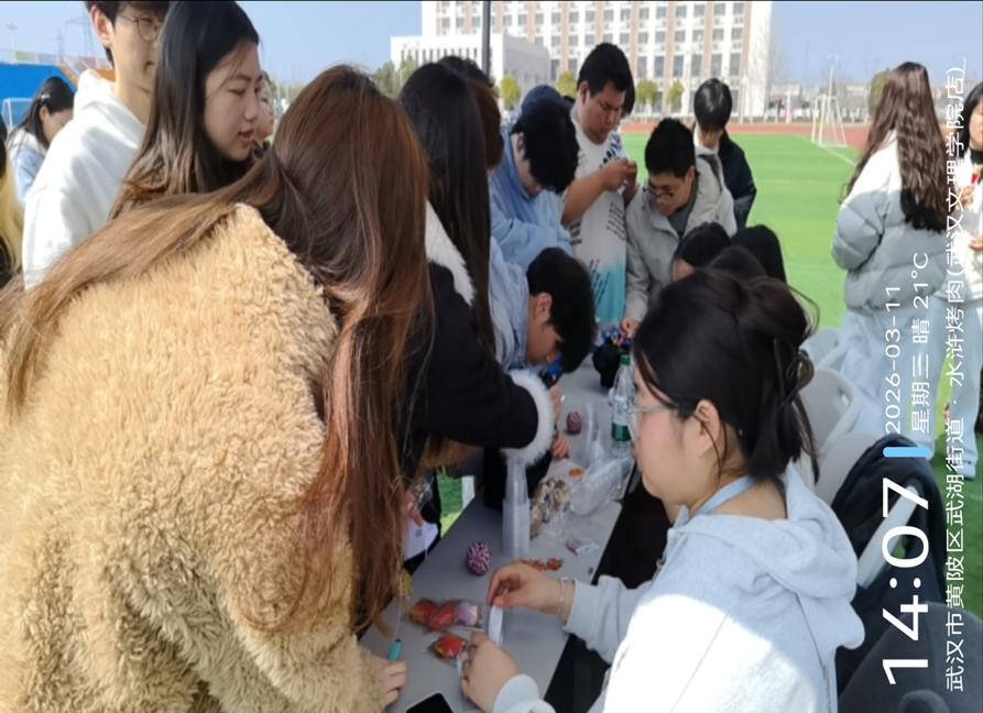 “原来废弃的杯子和落叶,也能变成这么好看的风铃!”一位参与同学惊喜地说道。在这个摊位,环保理念不再是抽象的口号,而是化作了可触可感的创作实践。当一串串风铃在摊位前轻轻摇曳,仿佛整个春天都在为这份创意鼓掌。