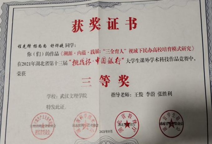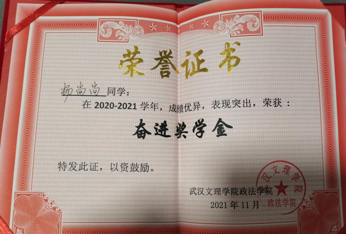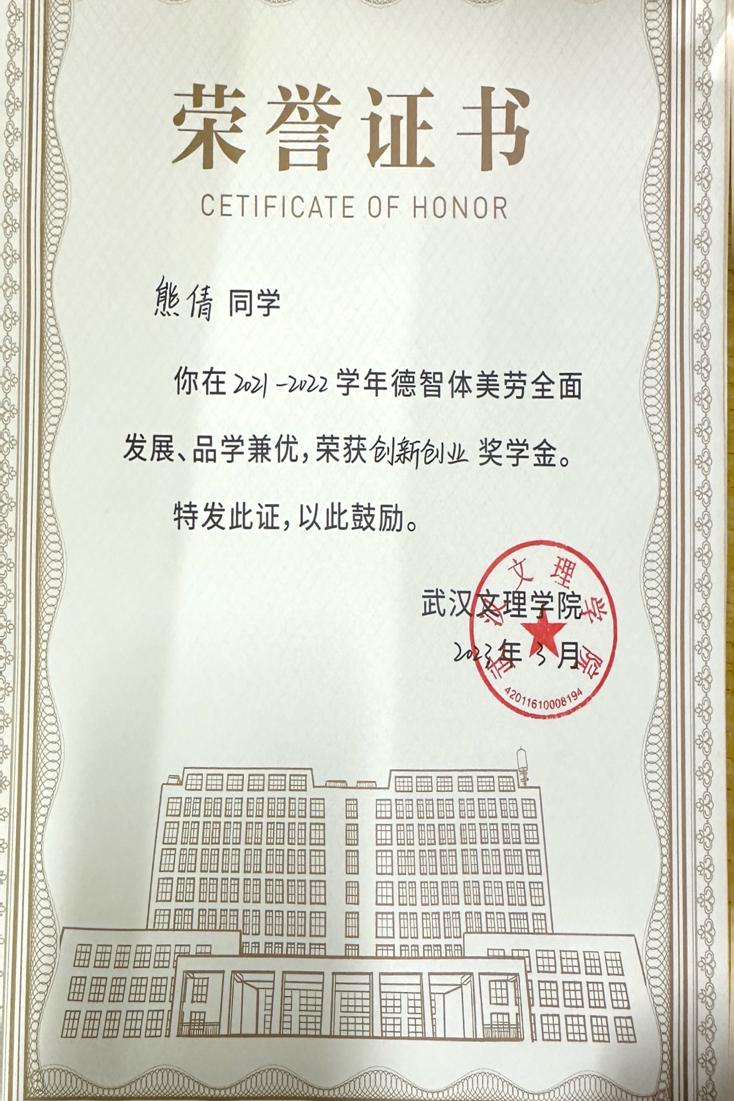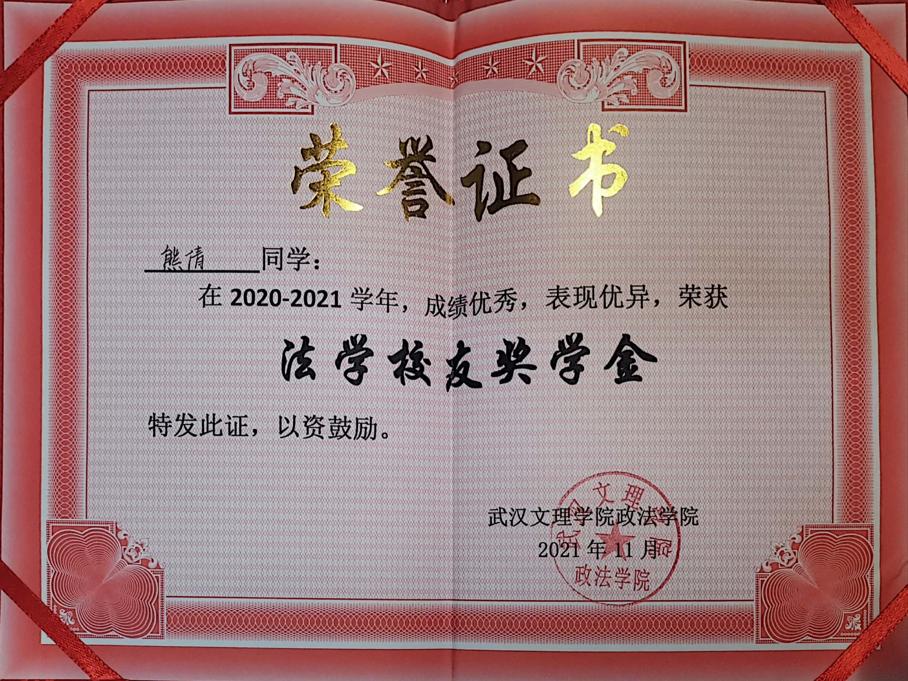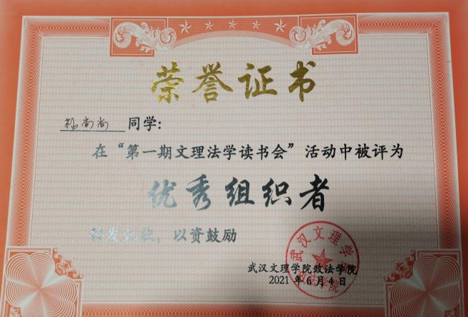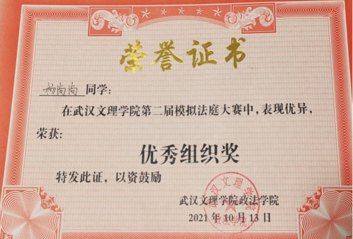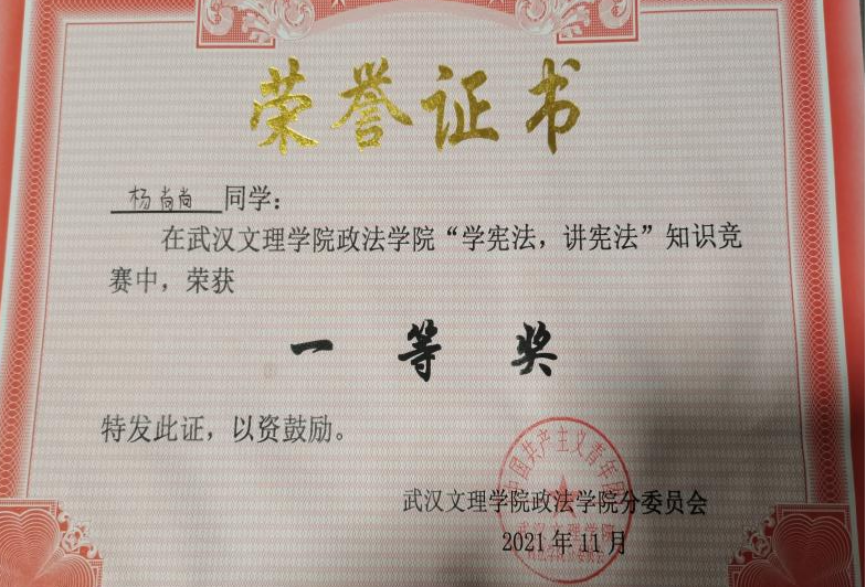 先后荣获“军训优秀学员”、“2019—2020年校级三等奖学金”、“第四届校内辩论赛冠军”、“湖北省第十三届挑战杯•中国银行大学生课外学术科技作品竞赛省赛三等奖”、“2020—2021年心理剧大赛一等奖以及最受观众喜爱奖”、“第一期文理法学读书会优秀组织者”、“2020-2021年奋进奖学金”、“学宪法,讲宪法知识竞赛一等奖”、“第二届模拟法庭大赛优秀组织奖”、“2021-2022年校级二等奖学金”等荣誉。