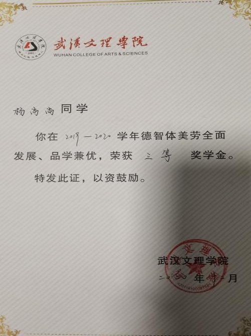 2019-2020学年获得yl7703永利集团优秀学生干部奖学金