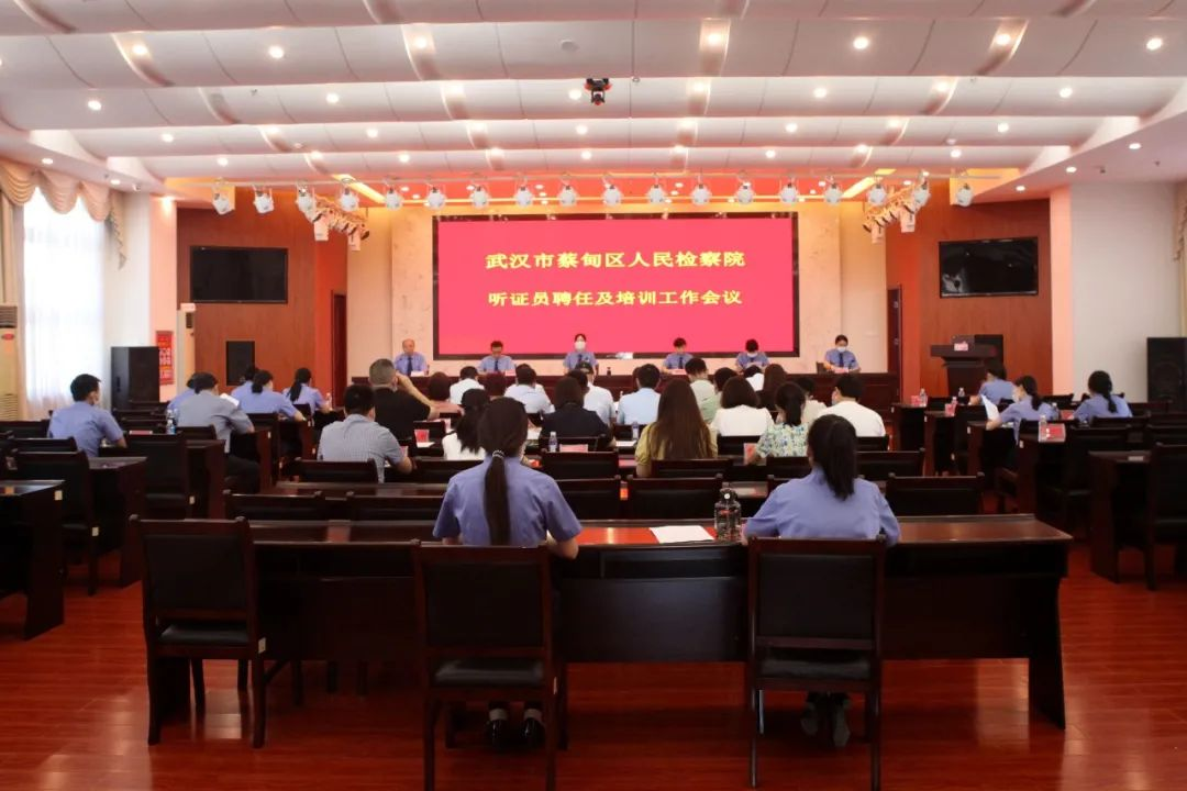 2022年6月17日,武汉市蔡甸区人民检察院举办首届听证员聘任大会,为第一批听证员颁发聘书,并纳入检察听证员库。武汉市人民检察院案件管理办公室主任王琼、三级高级检察官许兵受邀出席。蔡甸区人民检察院党组书记、检察长罗永鑫出席会议并讲话,党组成员、副检察长李书乔主持会议,党组副书记、副检察长陈邦华、党组成员、政治部主任郑君、各部门负责人、检察官参加会议。