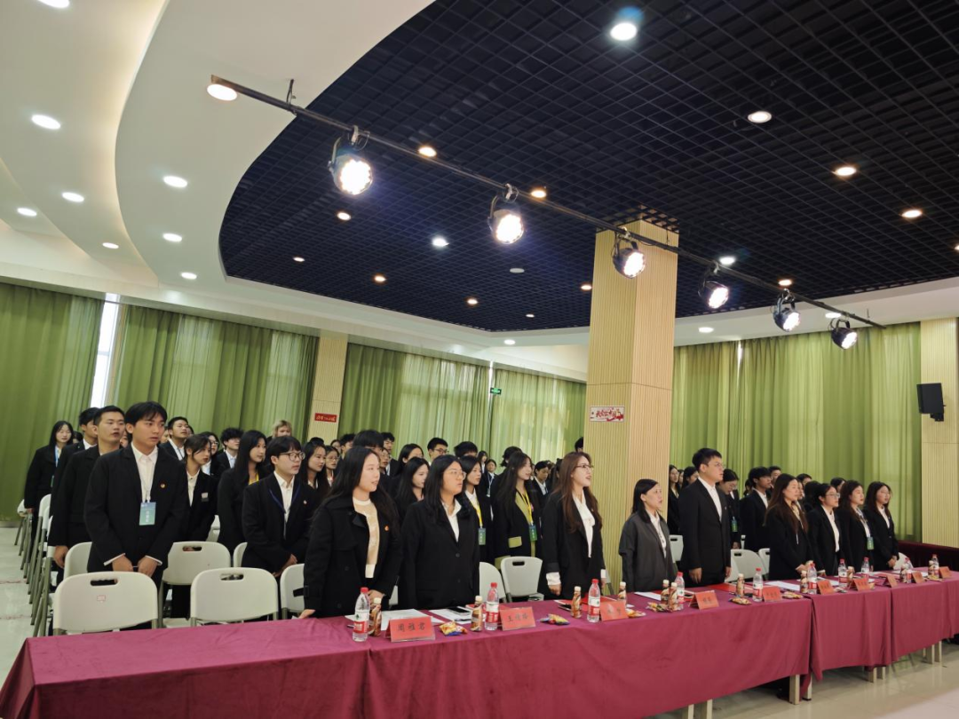 当激昂雄壮的旋律——《义勇军进行曲》响起,全场肃立,全体与会代表齐声奏唱国歌,正式拉开了yl7703永利集团第四届学生代表大会的帷幕。