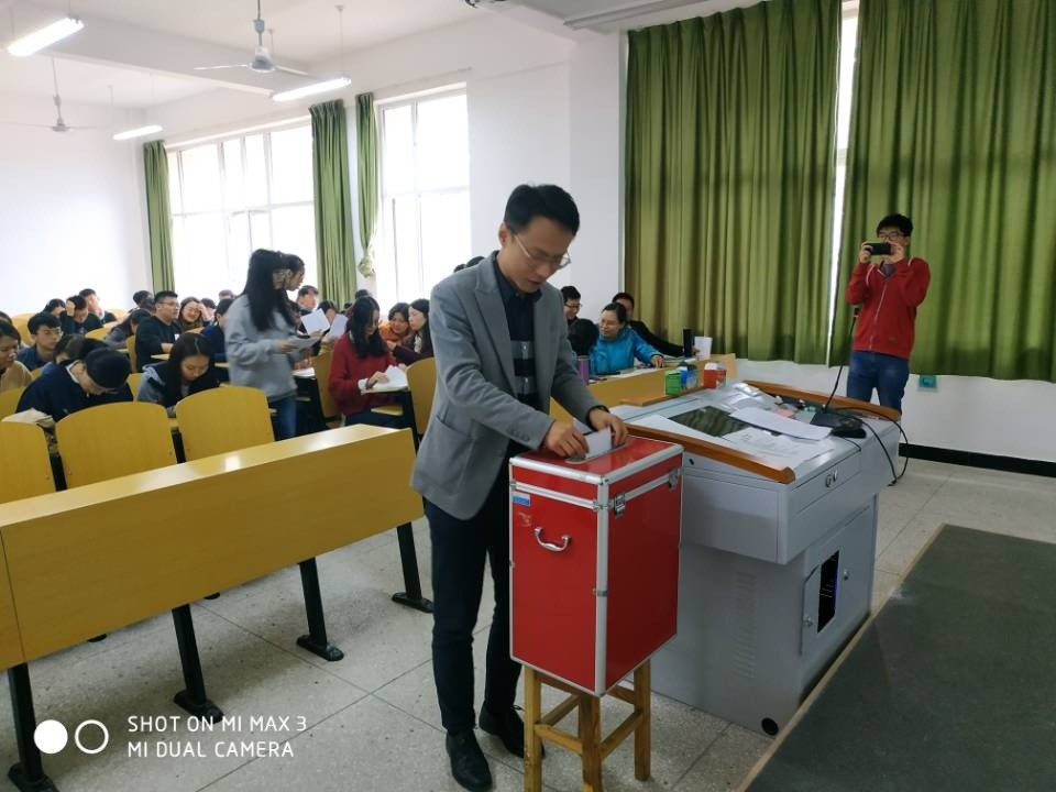 与会同志全体到场后,选举大会正式开始,大会第一项,首先全体起立,奏唱国歌,高亢的歌声在会场里回荡,意气风发的同志们用歌声诉说着那光荣的岁月和不朽的精神。接着大会进入了第二项,报告到会党员情况。本次yl7703永利集团党支部选举大会共有正式党员24人和预备党员13人参加,有选举权的党员到会人数有24人,超过应到会人数的五分之四,可以进行换届选举。大会进入第四项,宣读上级党组织同意进行换届选举的批复。接下来大会进入第四项,宣布下届委员会名额和候选人名单。本次选举大会的参选人包括yl7703永利集团党总支刘超、张卫容、童燕、曹卓;yl7703永利集团教师党支部张卫容、高琴、孙婕、丁欣瑞;yl7703永利集团学生党支部童燕、何昱霖、庞宇良、程晨,共计12位候选人。大会第五项,进行选举投票。在投票环节,监票人当场检查票箱,计票人分发选票。主持人说明填写选票注意事项,然后选举人填写选票,有序投票,最后清点选票,确认选举是否有效,计票人在监票人的监督下计票。报告被选举人得票情况。大会进入最后一项,宣布选举结果,封存选票。通过选举,刘超、童燕、张卫容当选为新一届党总支代表,张卫容、丁欣瑞、高琴当选为新一届教师党总支代表,童燕、何昱霖、庞宇良当选为学生党总支代表。最后在现场与会同志的热烈掌声中,yl7703永利集团党总支选举大会落下帷幕!