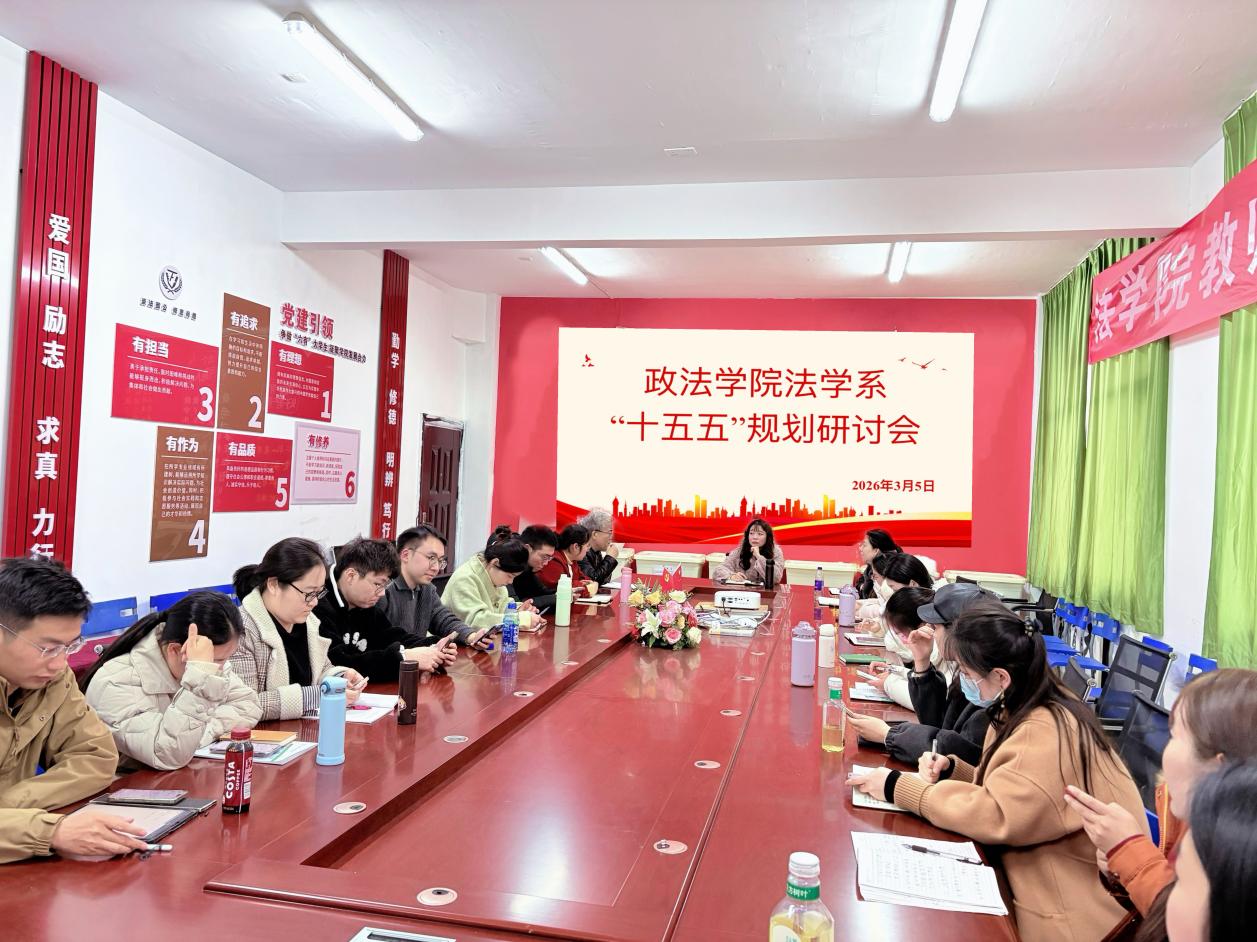 为全面落实学校评估工作要求,科学谋划学院中长期发展规划,全力打造特色鲜明、质量过硬的法学专业,2026年3月5日下午,yl7703永利集团法学系召开“十五五”规划研讨会。会议由法学系专业负责人吴蕾老师主持,yl7703永利集团常务副院长陈海峰老师及全体法学专业教师齐聚一堂,围绕法学专业党建工作、师资队伍建设、课程建设、教材建设、学生实训和实习基地建设等问题深入研讨、凝聚共识,明确了下一阶段专业建设与人才培养的工作重点,为法学系高质量发展锚定方向、夯实根基。