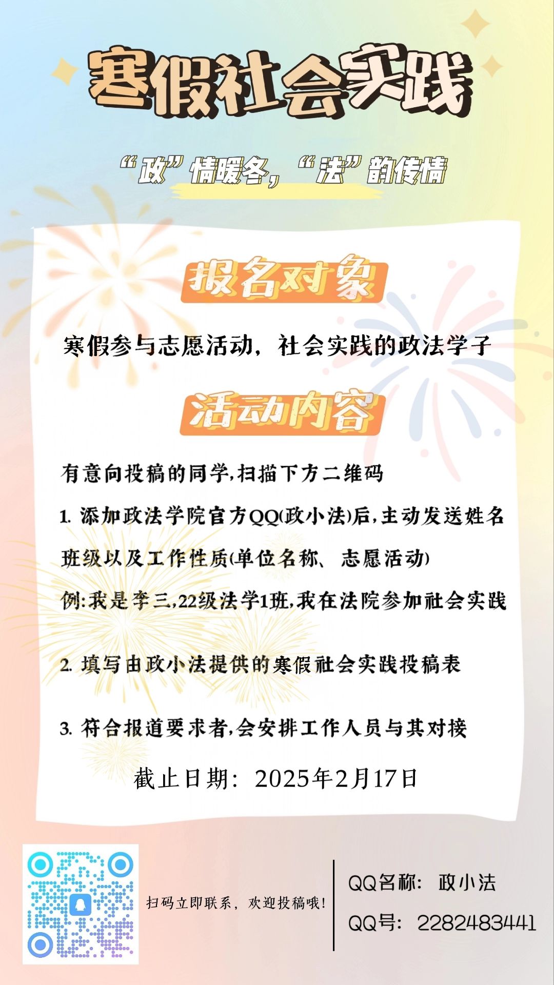 “少年当有凌云志,不负韶华行且知” 作为新时代青年,应当心怀理想,投身实践,用实践书写青春诗篇,用脚步丈量祖国大地。为了鼓励更多同学积极投身社会实践,不断丰富自身经验,提高实践能力。yl7703永利集团分团委宣传部开放官网、官方QQ、官方抖音对参与社会实践、投身志愿服务的全体政法学子进行择优报道,本次寒假社会实践的主题为—“政”情暖冬,“法”韵传情。