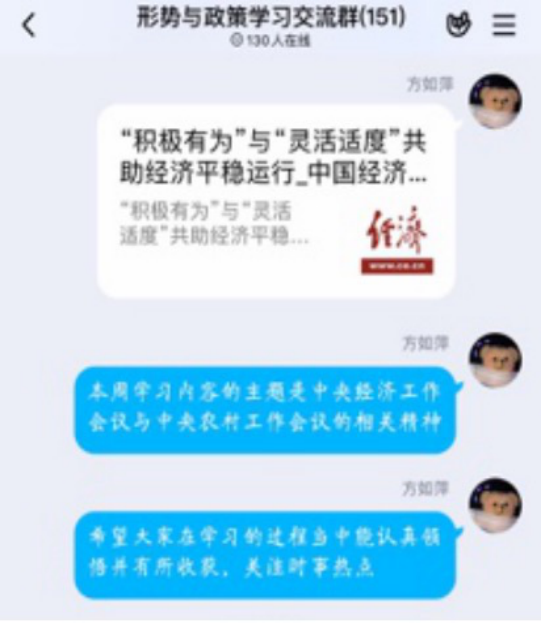 方如萍深感作为“形势与政策”课教师上好抗疫第一课的重要性,在老家没有电脑,没带教材的不便条件下,利用一部网络信号并不好的手机收集了大量的图片、文字、视频资料与学生分享抗疫过程的真善美,并将该门课程的第一个专题“2019年中央经济工作会议及中央农村工作会议解读”与抗疫期政府对恢复经济平稳运行的宏观支持政策有机结合起来,让学生们切实感受到我国精准扶贫的“一个不能少”和抗击新冠疫情的“一个患者不漏掉的”的“人民至上”的治国理念。